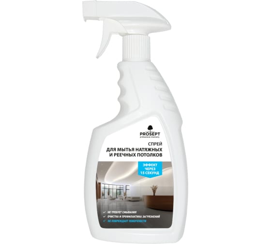 Насадку распылителя повернуть в положение Spray. Распылить средство на поверхность. Через 15-20 секунд протереть сухой безворсовой салфеткой. При необходимости и обработку повторить. На цветных потолках и потолках с фотопечатью применять после проверки на малозаметном участке.