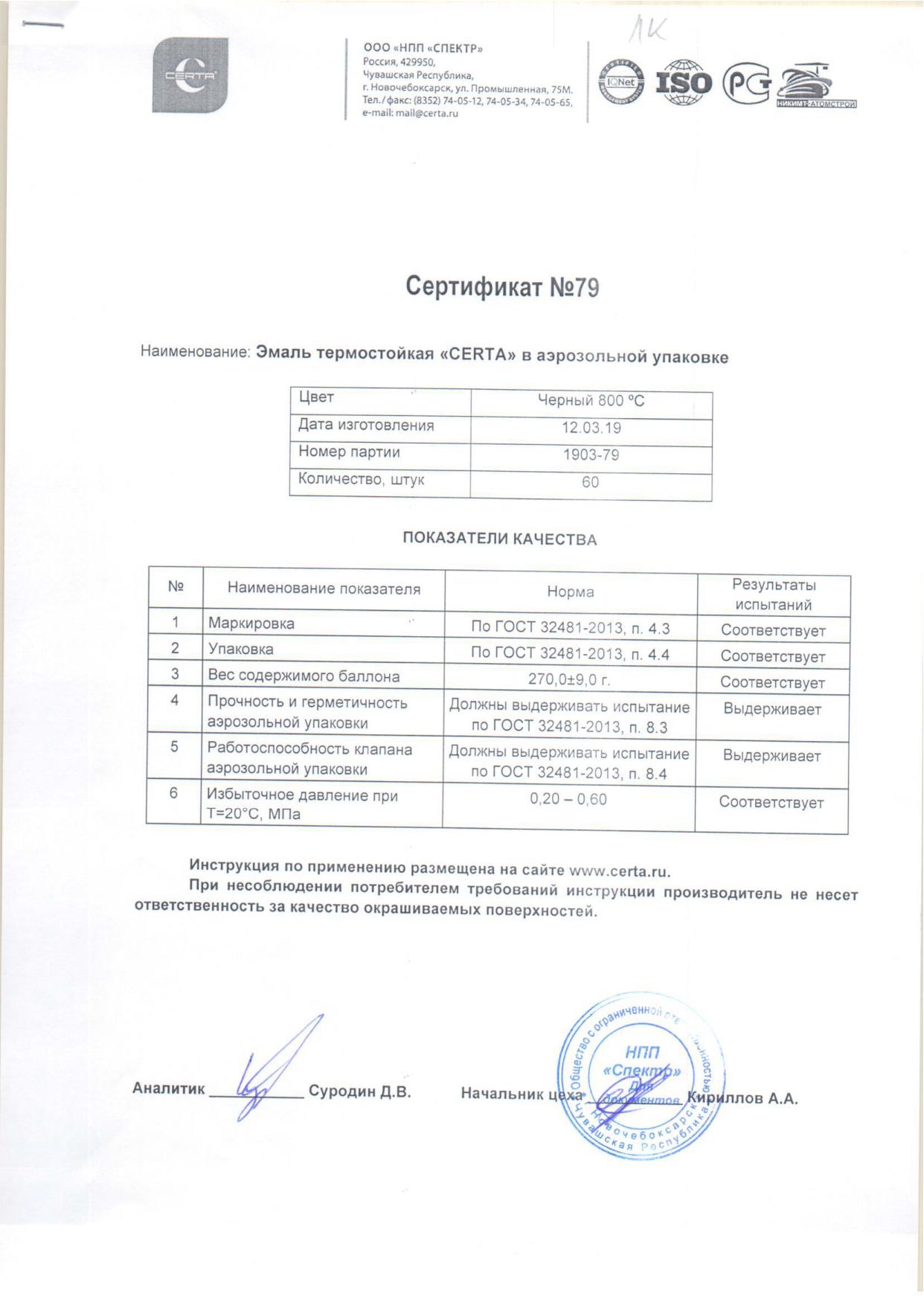 Эмаль CERTA термостойкая аэрозольная чёрная 520мл (до 800градусов С) RAL9004