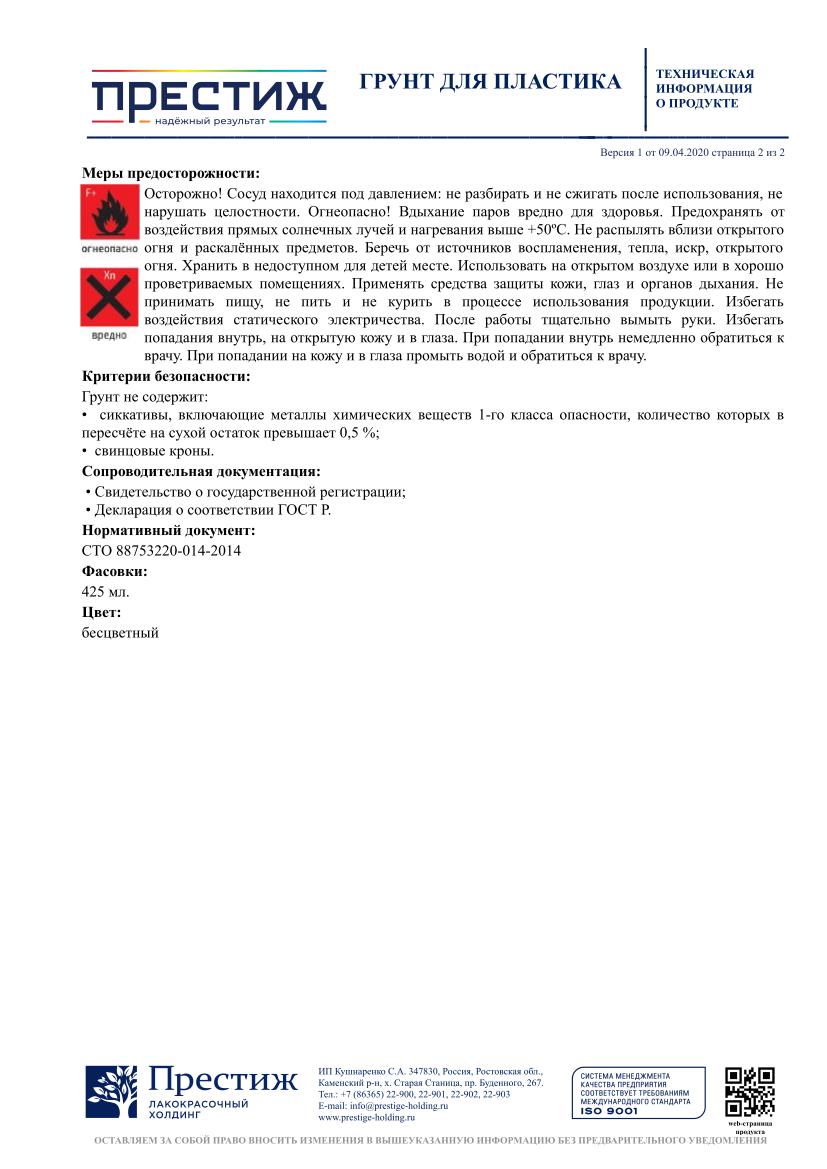 Аэрозольный грунт ПРЕСТИЖ для пластика 425мл