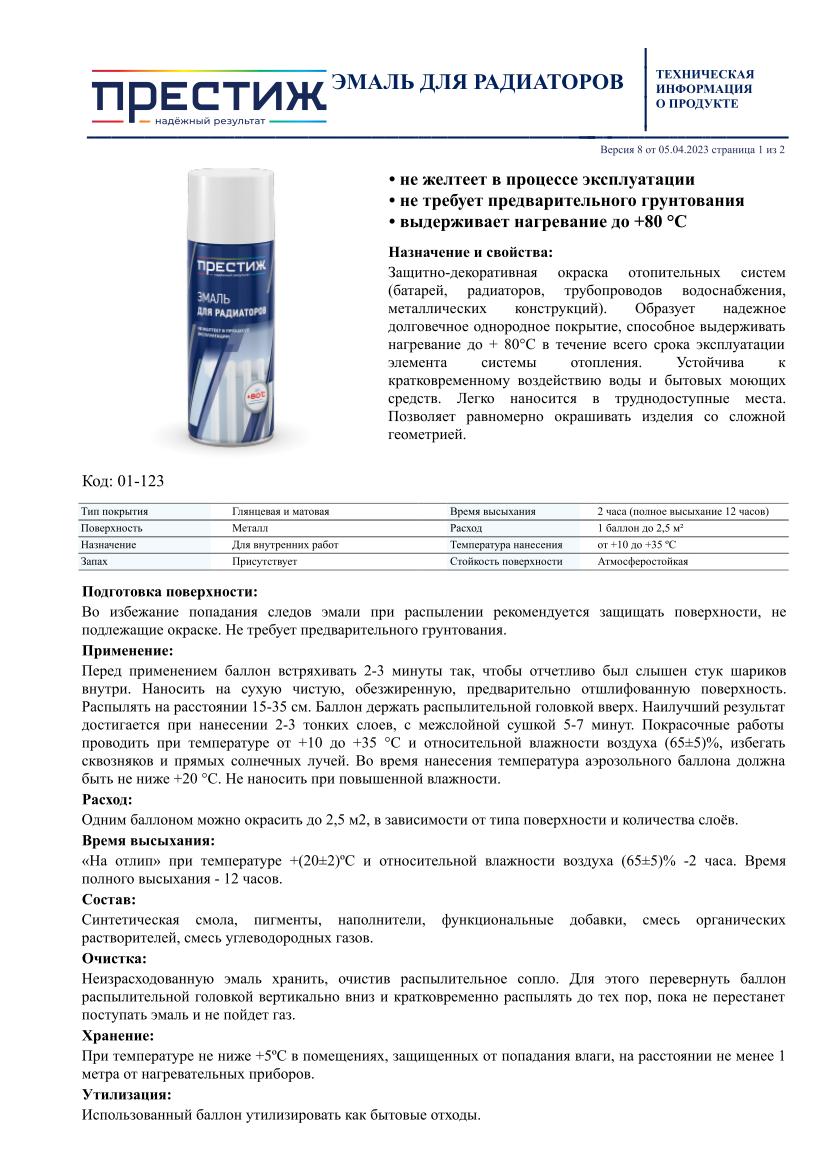 Аэрозольная эмаль ПРЕСТИЖ для радиаторов белая глянцевая 425мл