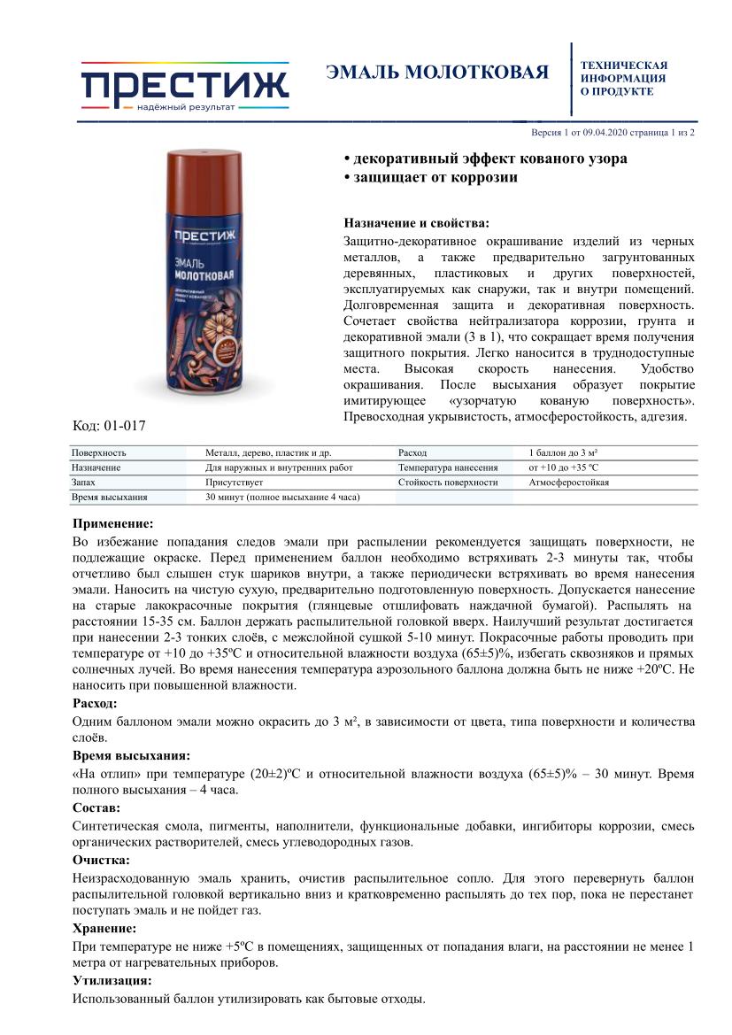Перед применением баллон необходимо встряхнуть 2-3 минуты так, чтобы отчетливо был слышен стук шариков внутри, а также периодически встряхивать баллон во время нанесения. Эмаль наносить на чистую, сухую, предварительно подготовленную поверхность. Допускается нанесение на старые лакокрасочные покрытия (глянцевые необходимо заматировать наждачной бумагой). Распылять на расстоянии 15-35 см. Наилучший результат достигается при нанесении 2-3 тонких слоев, с межслойной сушкой 5-10 минут.