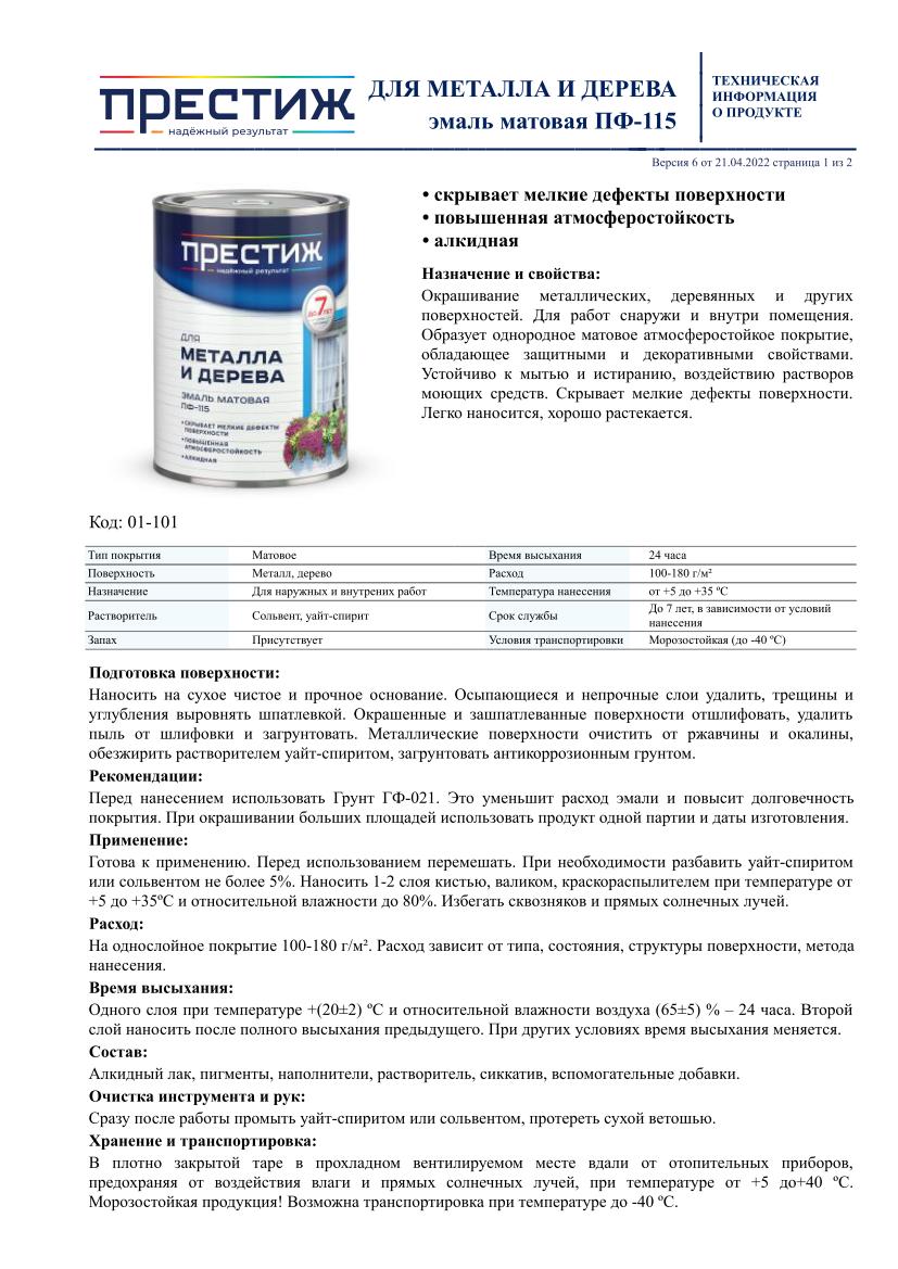 Эмаль ПРЕСТИЖ ПФ-115 белая матовая ГОСТ 1,9кг