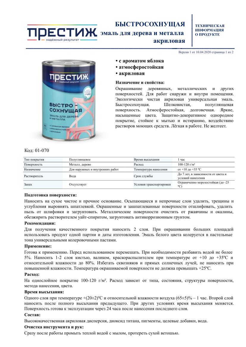 Перед использованием тщательно перемешать. При необходимости возможно разбавление водой (не более 10%). Расход на однослойной покрытие: 100–120 г/м². Для создания качественного покрытия рекомендуется двухслойное нанесение эмали.