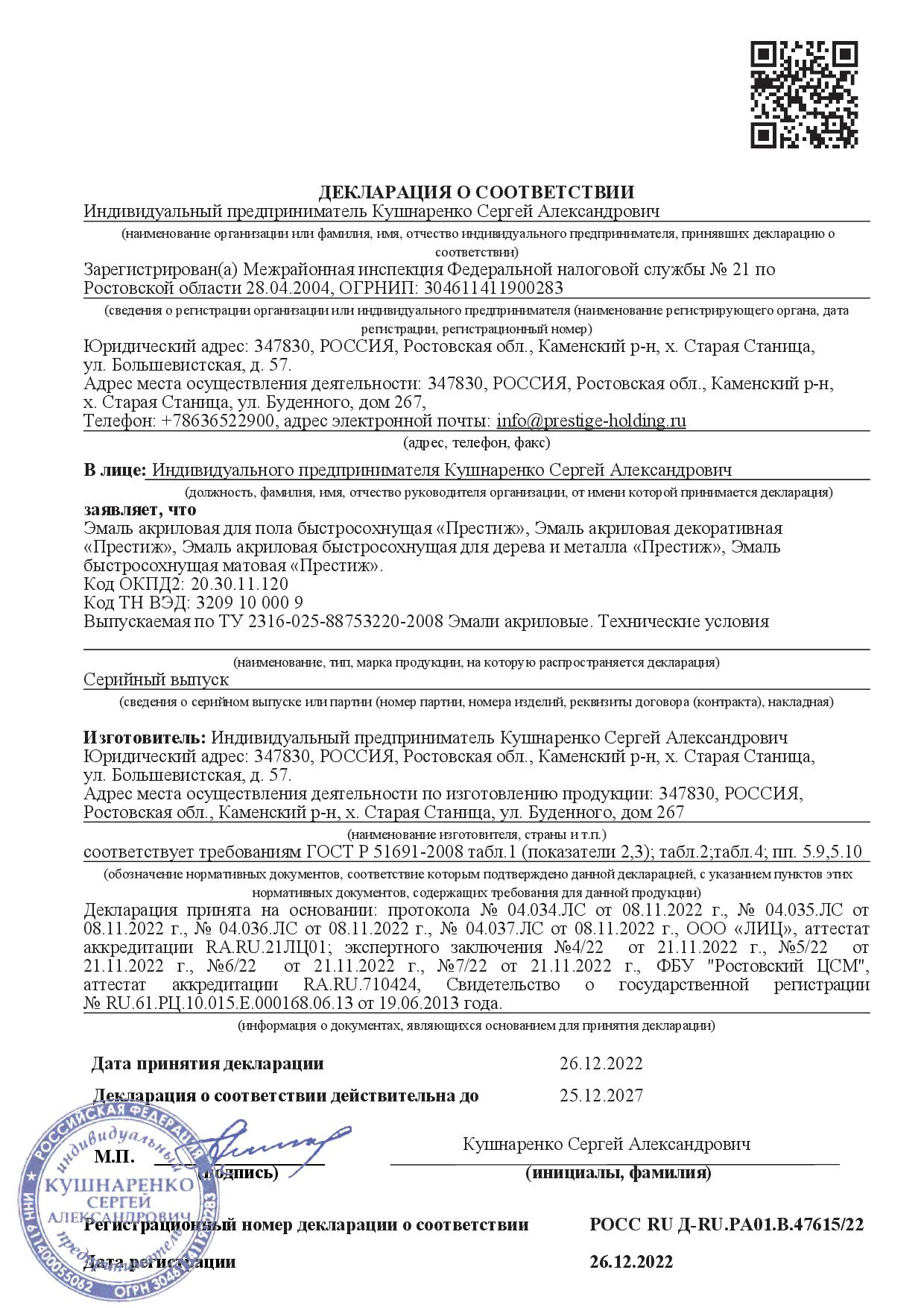 Эмаль ПРЕСТИЖ акриловая серая полуглянцевая 1,9кг