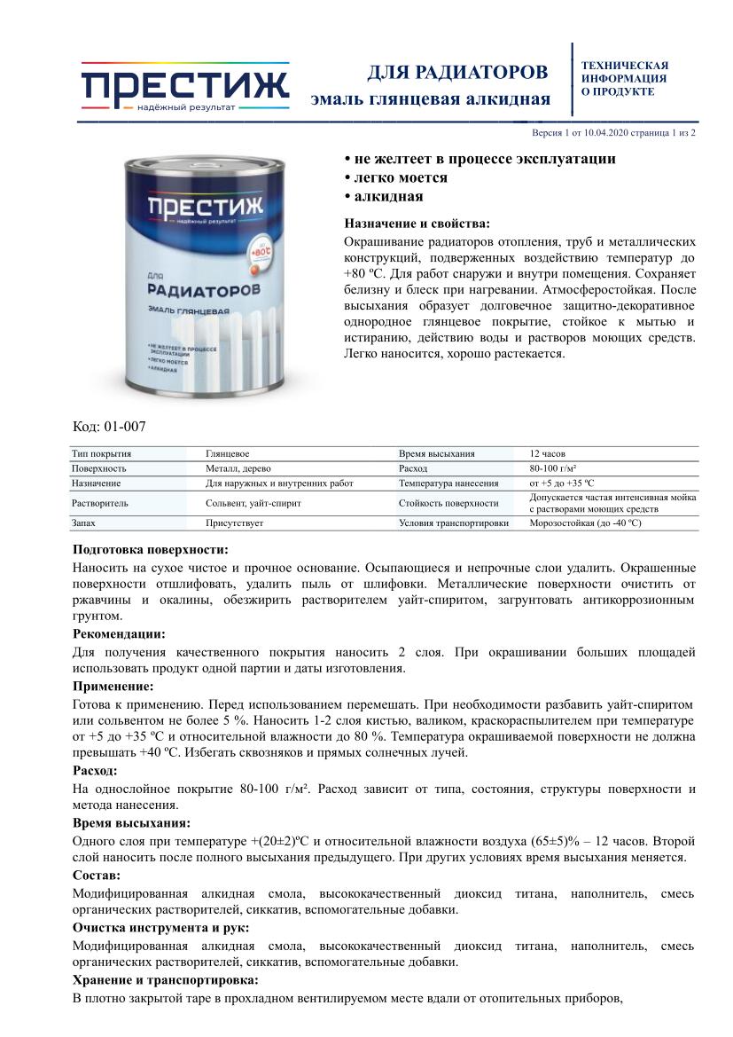 Эмаль ПРЕСТИЖ алкидная для радиаторов отопления белая 0,9кг