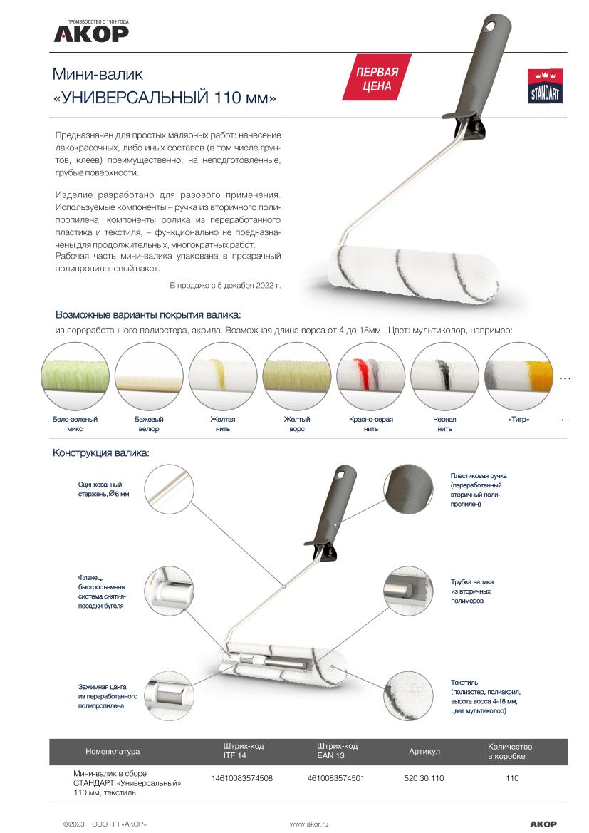 Валик 11 см в сборе текстиль Стандарт Универсальный d 6мм "Акор"