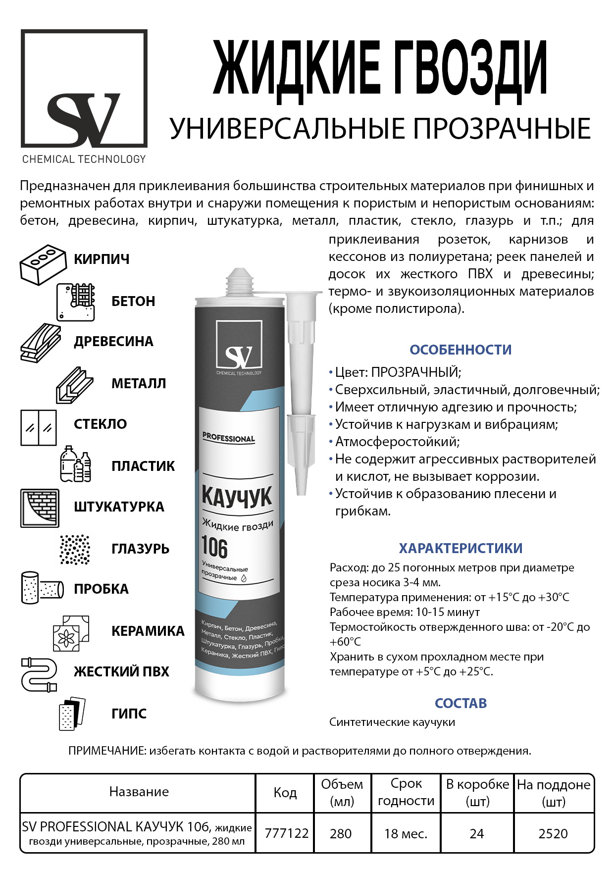 Жидкие гвозди SV Каучук 106 универсальные,прозрачные 280 мл