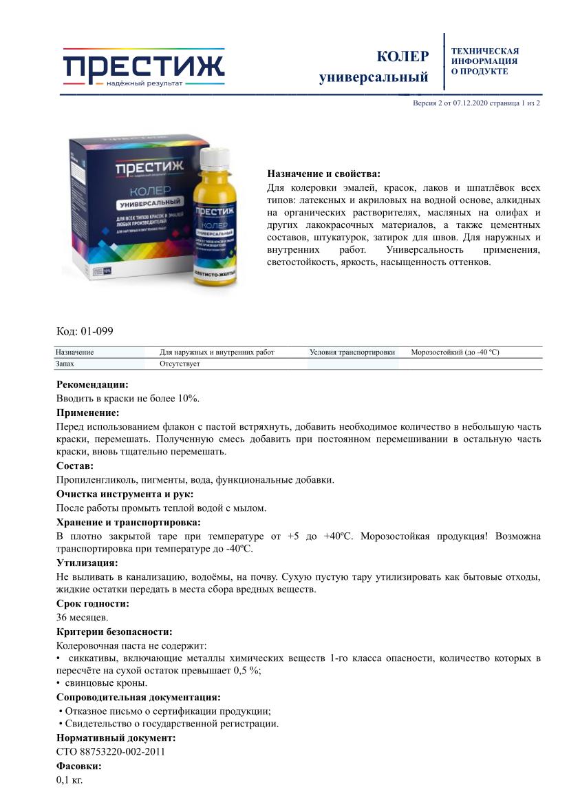 Светлые тона получаются при введении пасты 0,1– 0,5% от веса колеруемого материала. Позволяет колеровать глубокие тона. Паста содержит пигменты, обладающие высокой светостойкостью и атмосферостойкостью.