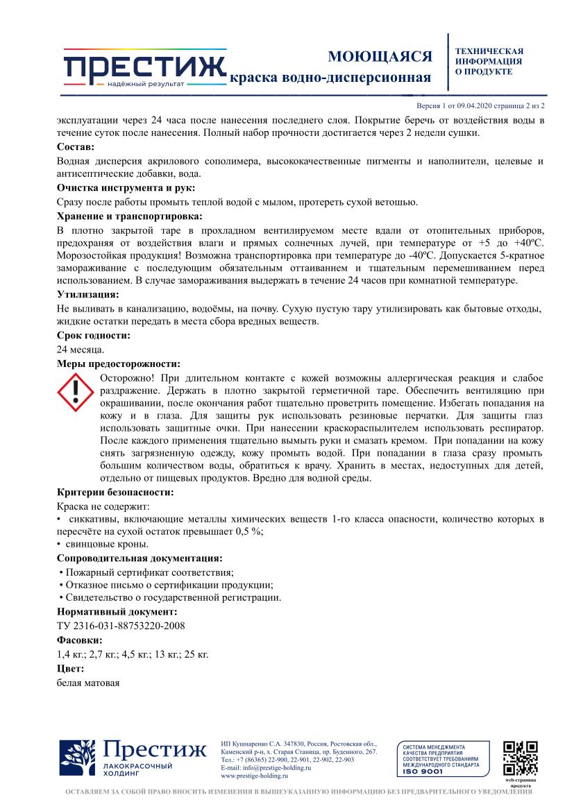 Краска ПРЕСТИЖ ВД моющаяся интерьерная 13кг