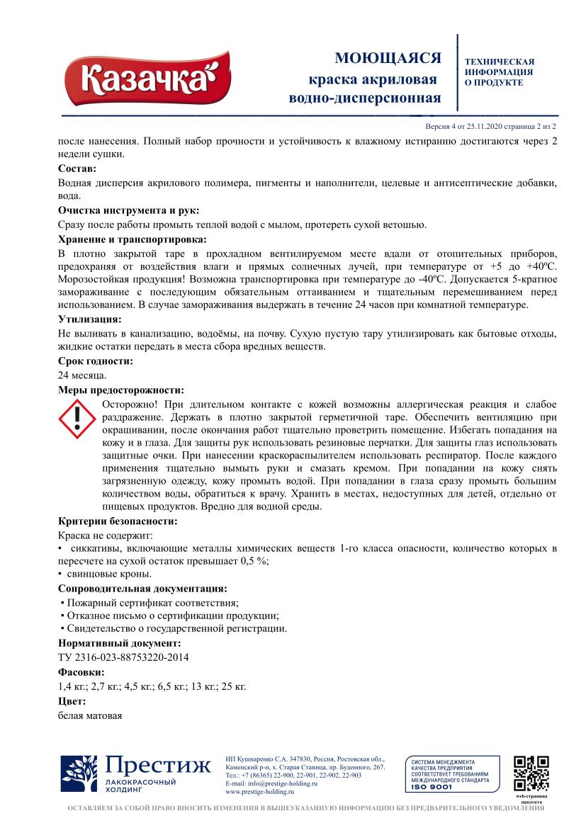 Краска КАЗАЧКА ВД-АК моющаяся (W4)13кг
