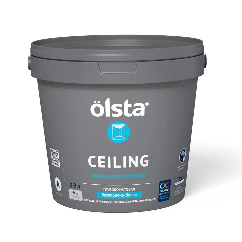 Краска OLSTA CEILING для потолков с высокой степенью белизны глубокоматовая база А 0,9 л