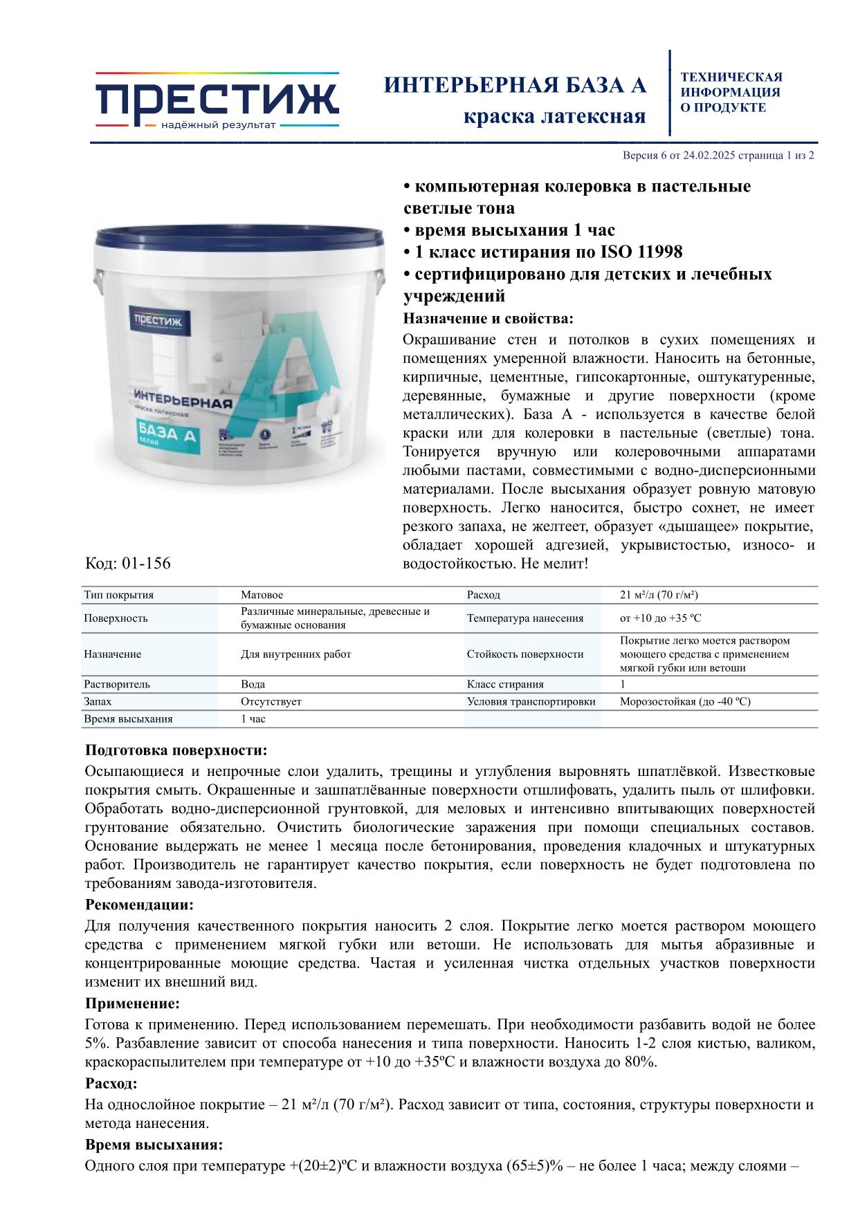 Краска Престиж ВД латексная интерьерная База А 9 л