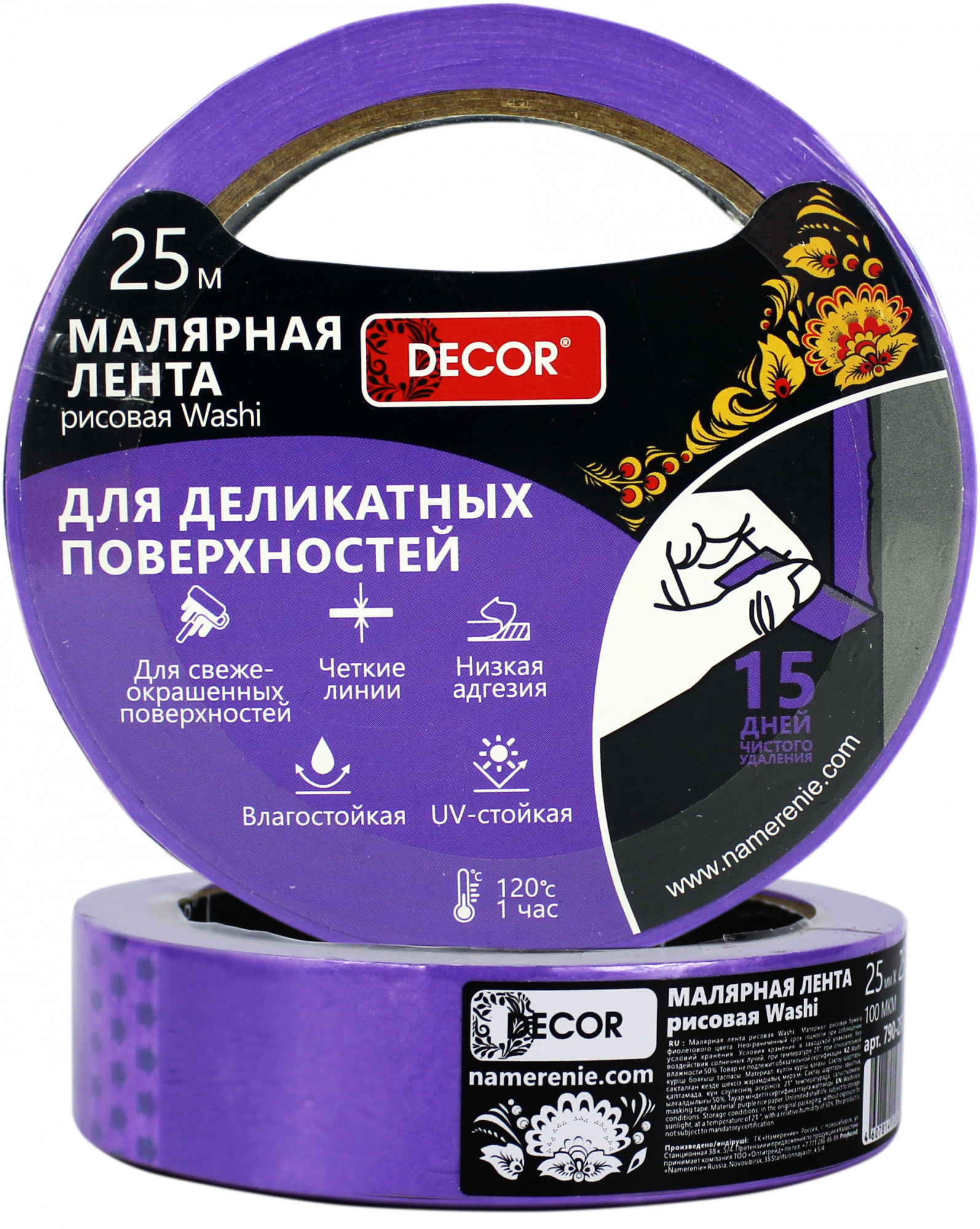 Лента малярная DЕCOR 9 мм х 25 м, фиолетовая, для деликатных работ