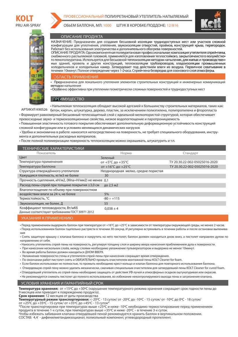 Однокомпонентная полиуретановая профессиональная композиция спрей-пены KOLT PPU AIR-SPRAY, снабженная распыляемой головкой, имеющая веерное распыление утеплителя обеспечивающее максимальное расширение и большую укрывистость поверхности и заполнение неровностей. Улучшает теплоизоляционные свойства кладки. Быстрое, удобное нанесение без использования большого объема воды, электричества. Не требует дополнительного монтажа каркасов и использования прочих материалов. Затвердевает под воздействием влаги из воздуха. Полное отверждение через 2 часа в слое 4-6 см. Не имеет адгезии: к полиэтилену, полипропилену, тефлону, полиамиду, силикону.
