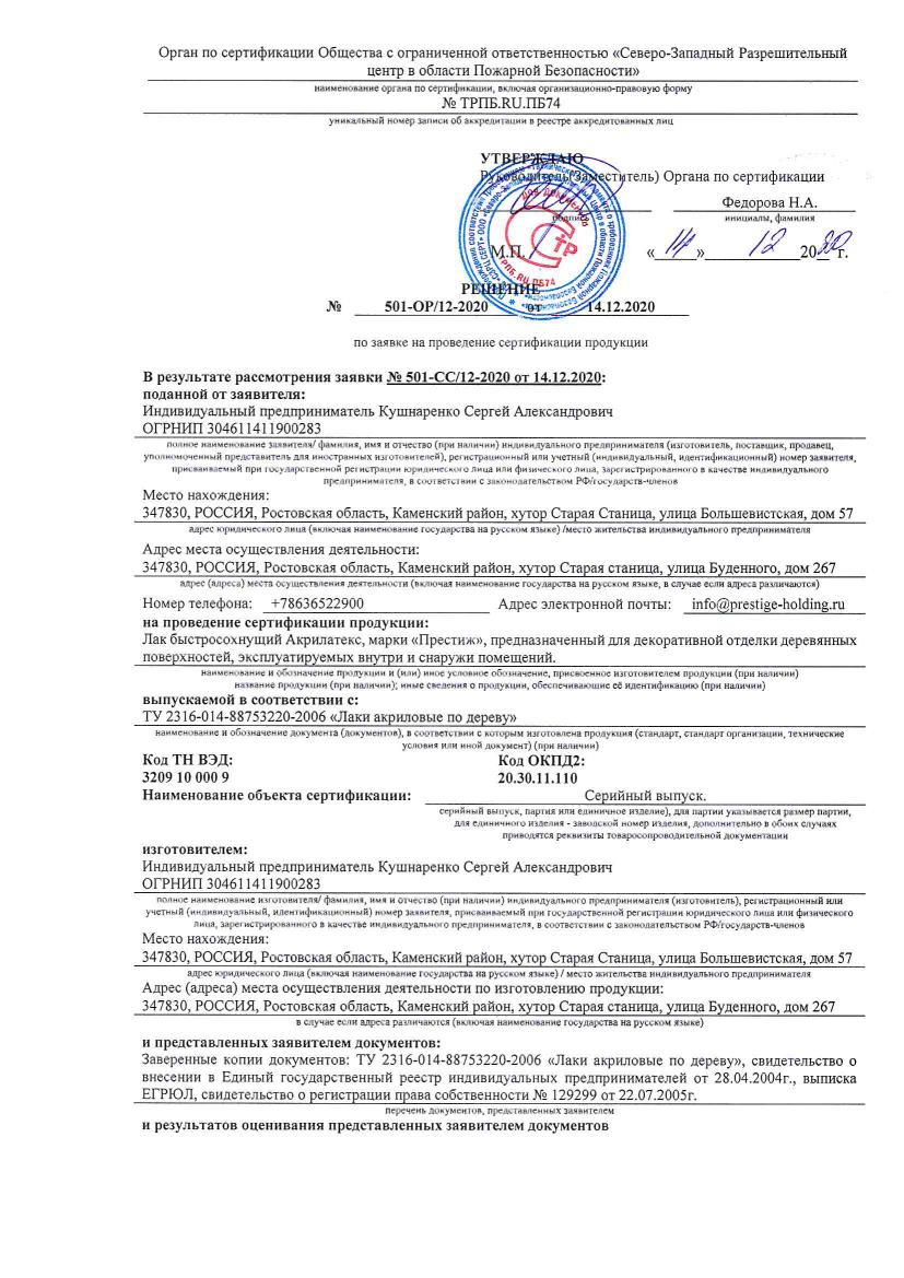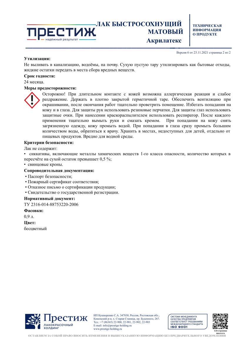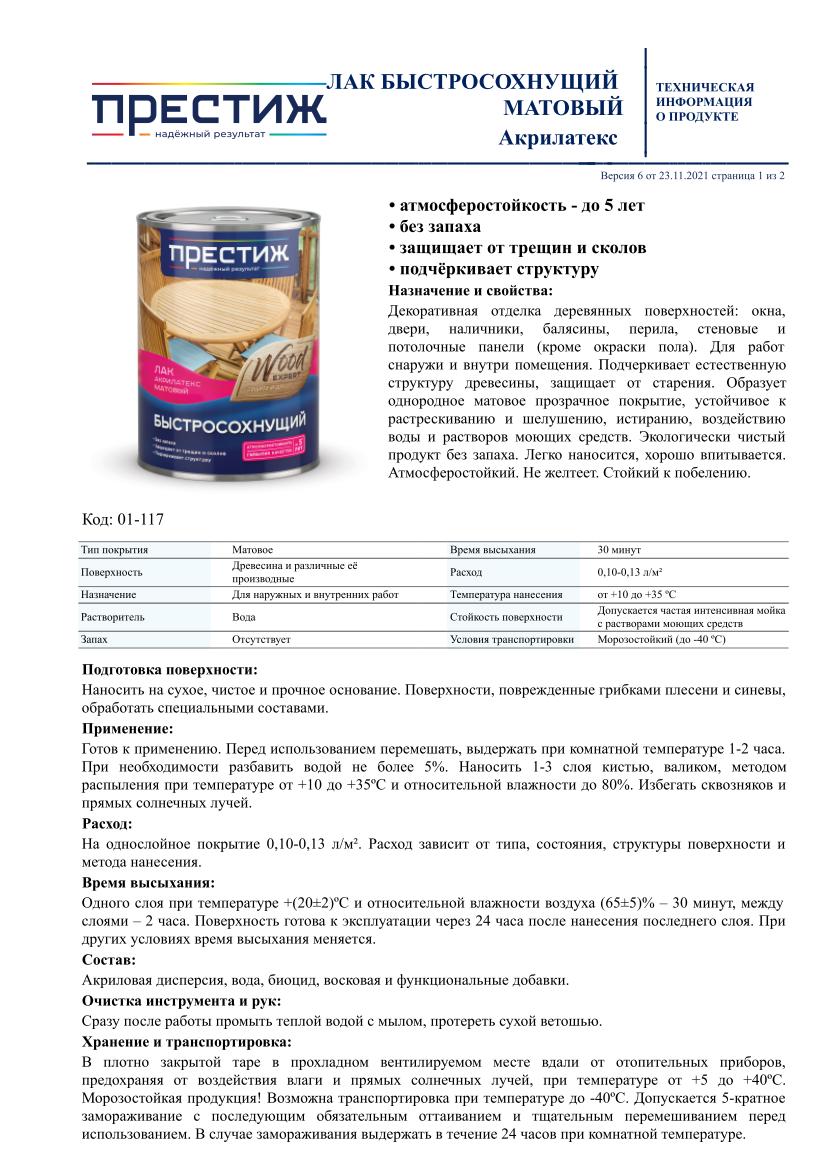 Лак ПРЕСТИЖ по дереву Акрилатекс быстросохнущий матовый 0,9л