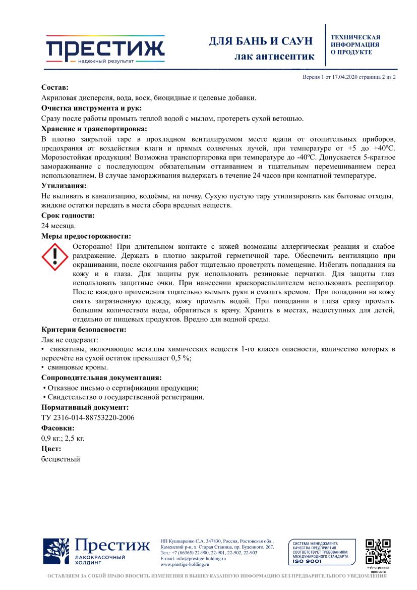 Лак ПРЕСТИЖ акриловый для бань и саун 0,9кг