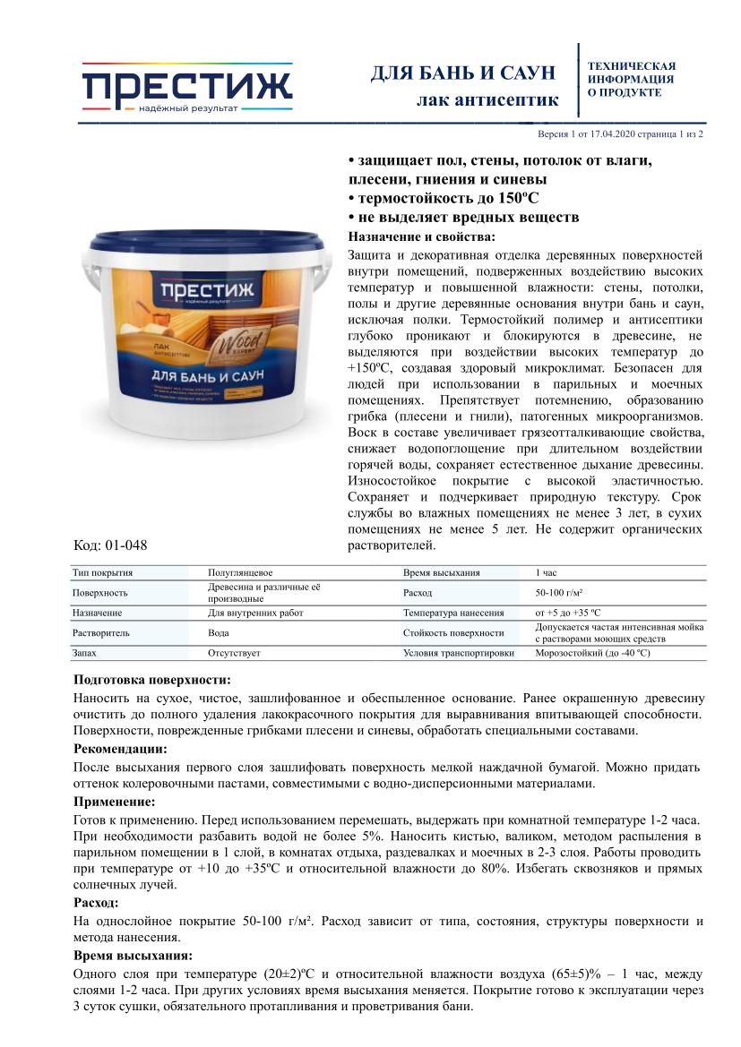 Время высыхания: до «отлипа» - 1 час, полное высыхание - 24 часа. Покрытие готово к эксплуатации через трое суток сушки, обязательного протапливания и проветривания бани.