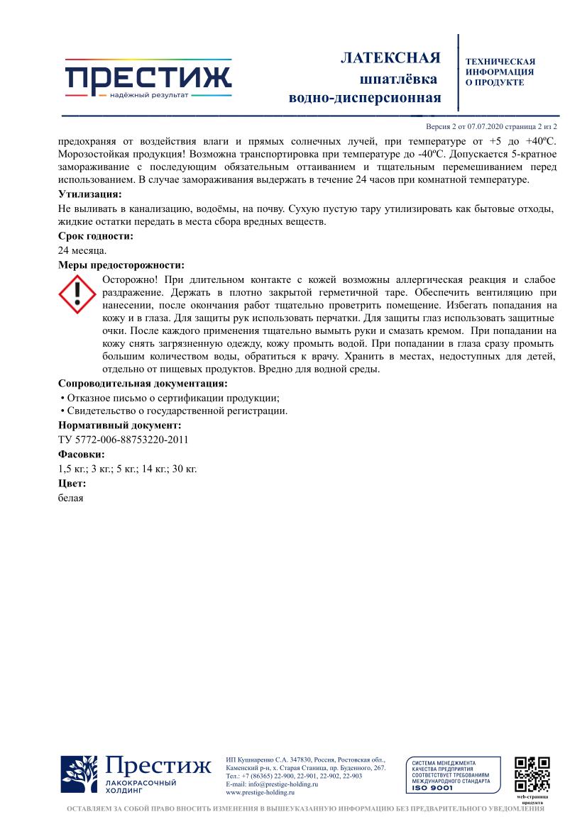 Шпатлевка латексная ПРЕСТИЖ 1,5кг