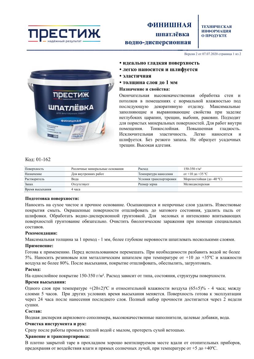 Окончательная высококачественная обработка стен и потолков в помещениях с нормальной влажностью под последующую декоративную отделку. Максимальные заполняющие и выравнивающие свойства при заделке неглубоких царапин, трещин, выбоин, раковин. Подходит для пористых минеральных поверхностей. Для работ внутри помещения. Тонкослойная. Повышенная гладкость. Исключительная эластичность. Легко наносится и шлифуется. Без резкого запаха. Не образует усадочных трещин. Высокая адгезия.